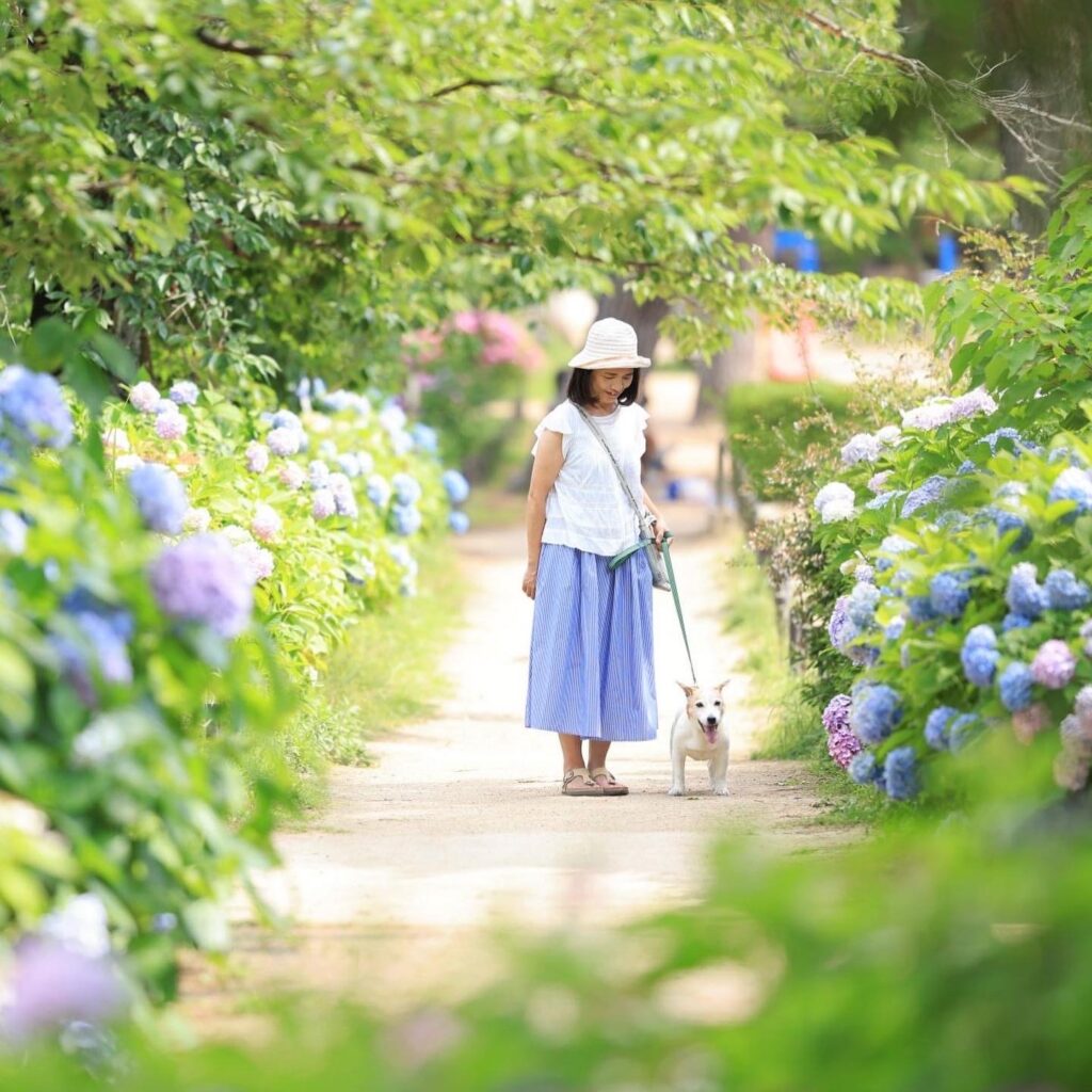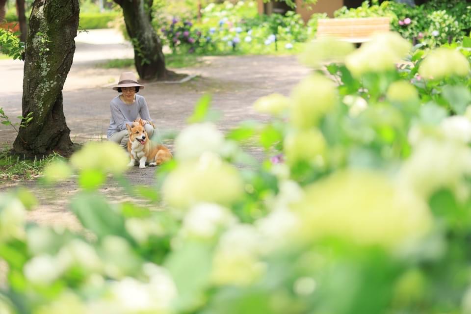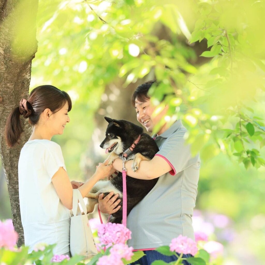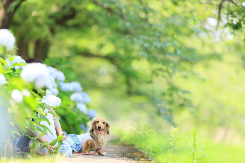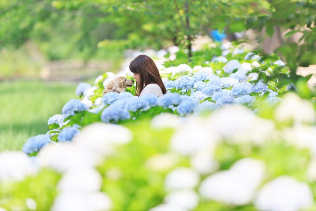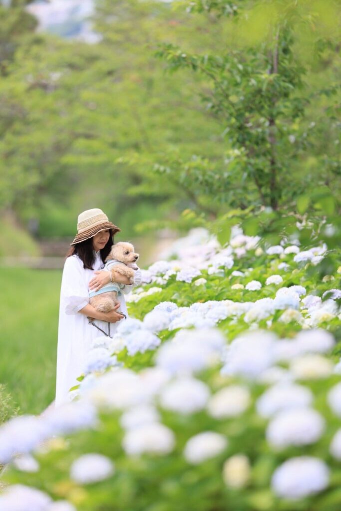 紫陽花と新緑の夙川公園で初夏の家族写真を撮影いたします。