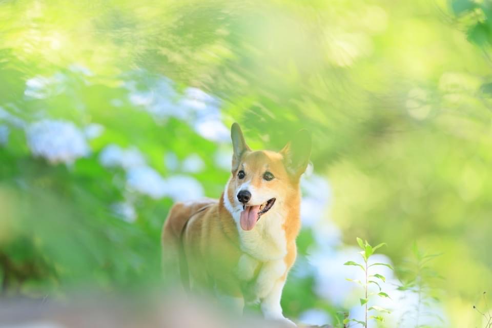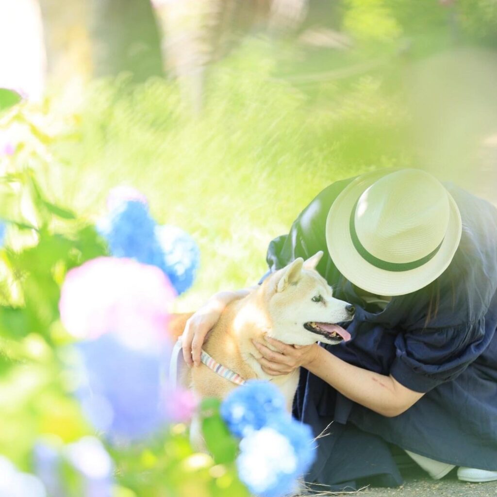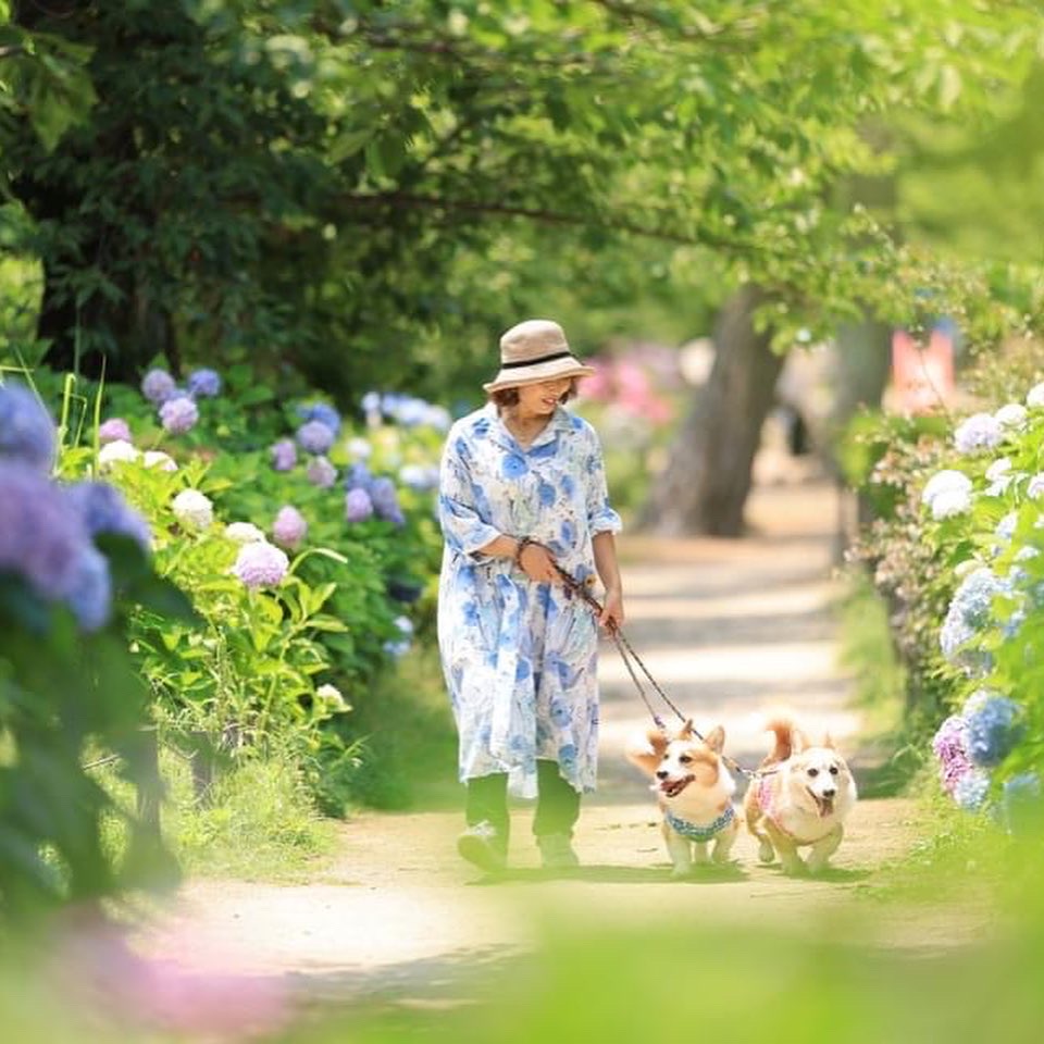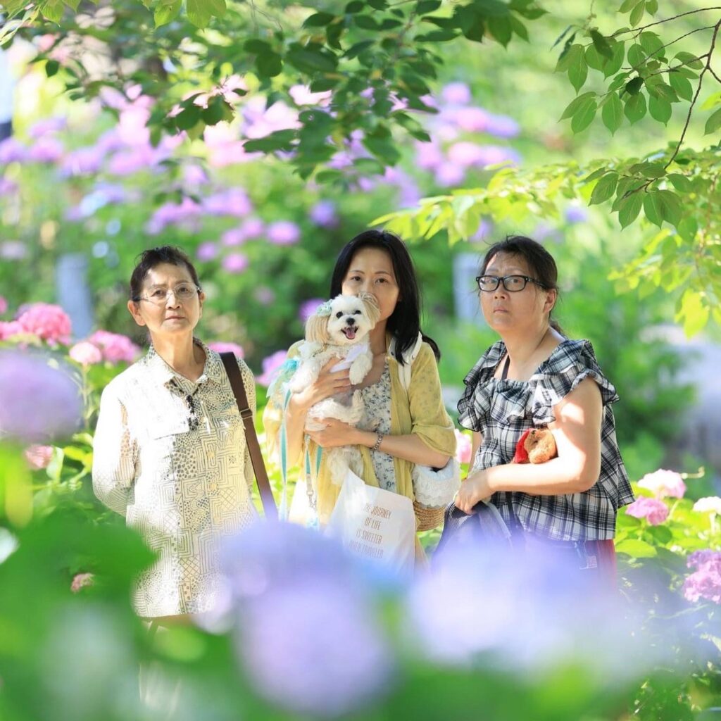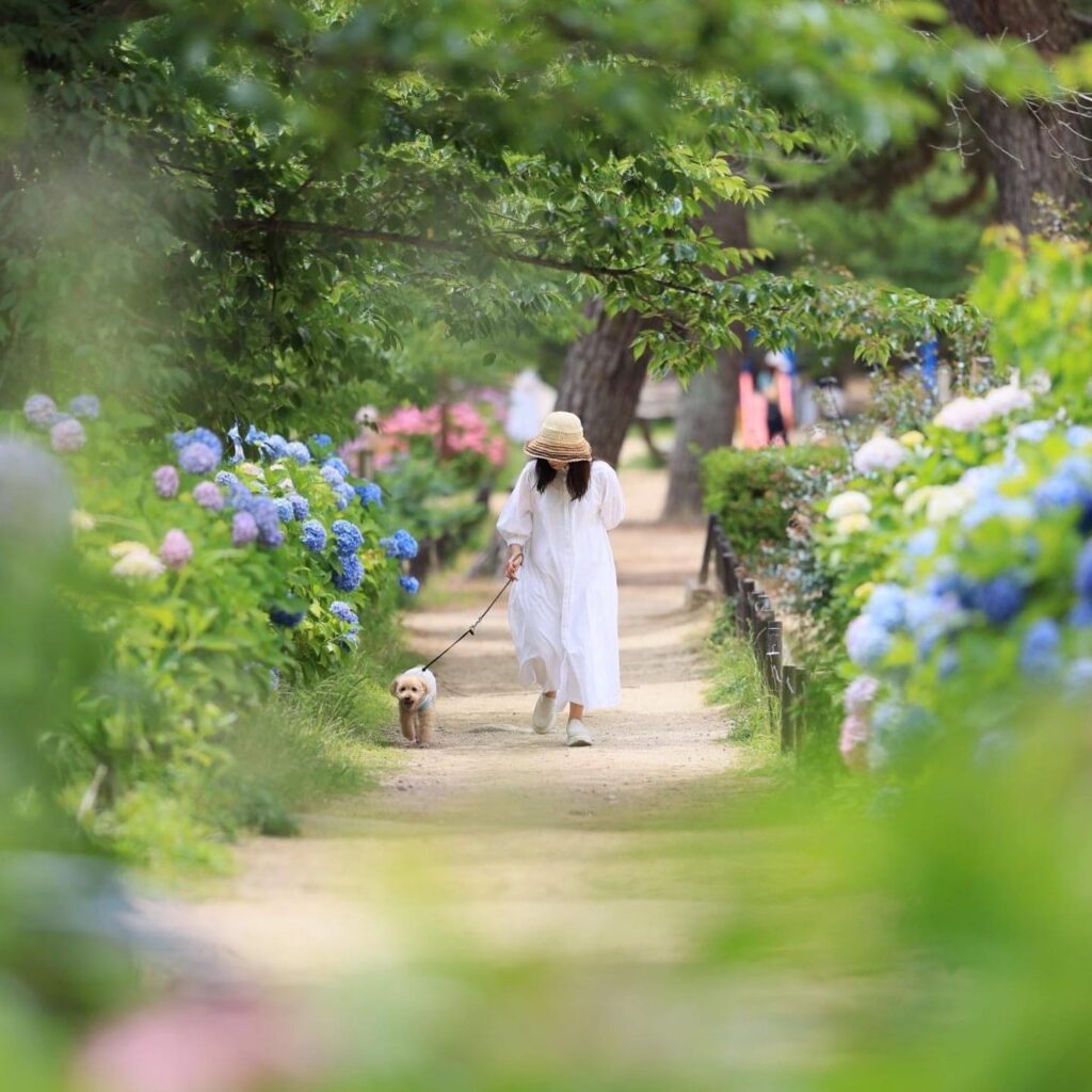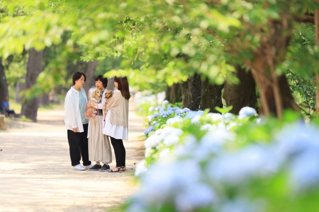 紫陽花と新緑の夙川公園で初夏の家族写真を撮影いたします。